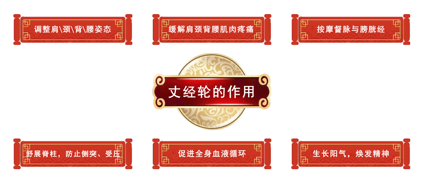 丈经轮是一款全新的脊背运动器械,其作用是通过脊背的滚轮运动来作用于脊背深层肌肉和筋膜层,消除脊背疼痛、矫正脊背姿态、健背消困提神。它适用于家庭,办公区域,瑜伽馆,健身馆等场所,既可作为个人运动器械,也可用作专业健身器材。保护脊背,消除疼痛是丈经轮的使命,能在个人健康保护方面发挥其特殊价值。